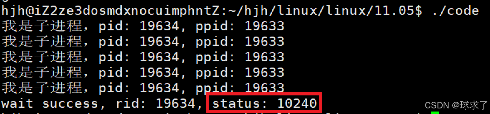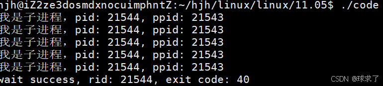 {pid_t id = fork();if (id == 0){int cnt = 5;while(cnt){printf("我是子进程,pid: %d, ppid: %d\n", getpid(), getppid());sleep(1);cnt--;}exit(40);}int status = 0;pid_t rid = waitpid(id, &status, 0);if (rid > 0){printf("wait success, rid: %d, status: %d\n", rid, status);}else{printf("wait failed: %d: %s\n", errno, strerror(errno));}return 0;