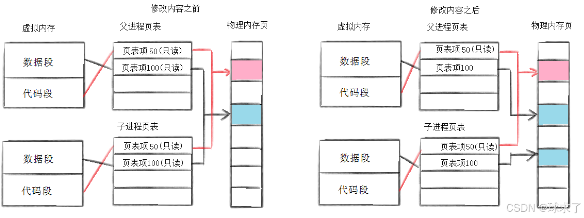 在创建子进程之后,数据段的数据就会变成只读的,在对数据段进行修改之后,操作系统发现对只读的字段进行修改,就会产生错误,这种错误导致了写时拷贝。