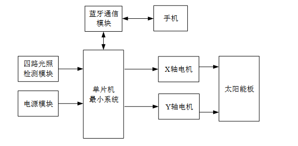 本课题太阳能光伏板倾角优化与自动调整系统的总体架构设计如图2.1所示,系统的主控制器采用Arduino UNO,通过四路光照传感器实现太阳能板的四个方位的光照强度检测,并通过SG90舵机控制太阳能板的转动以实现追光功能,在控制模式上有自动和手动两种模式,手动模式则可以通过手机控制,自动功能则根据光照自动调整,并设置有蓝牙通信功能,用户可以通过手机APP控制。