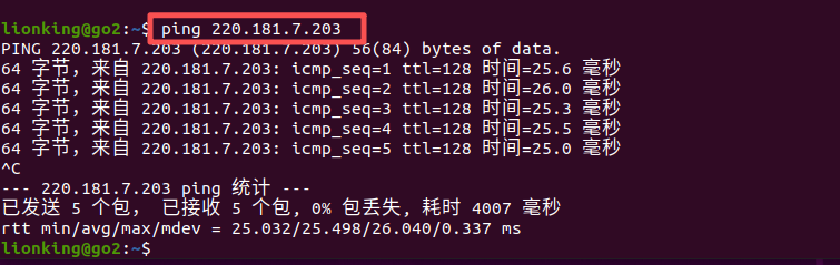 也可以在windows的终端ping baidu.com,主要是得到baidu.com的IP,然后在虚拟机终端里ping 这个IP,这样基本也是可以ping通的。