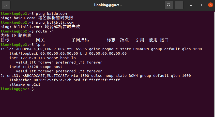 route -n这时候可能什么信息都不会显示,就像下面这样;输入ip a,如果也和我这个显示的差不多(ens33那里没有IP),那就可以按照我的方法来弄。