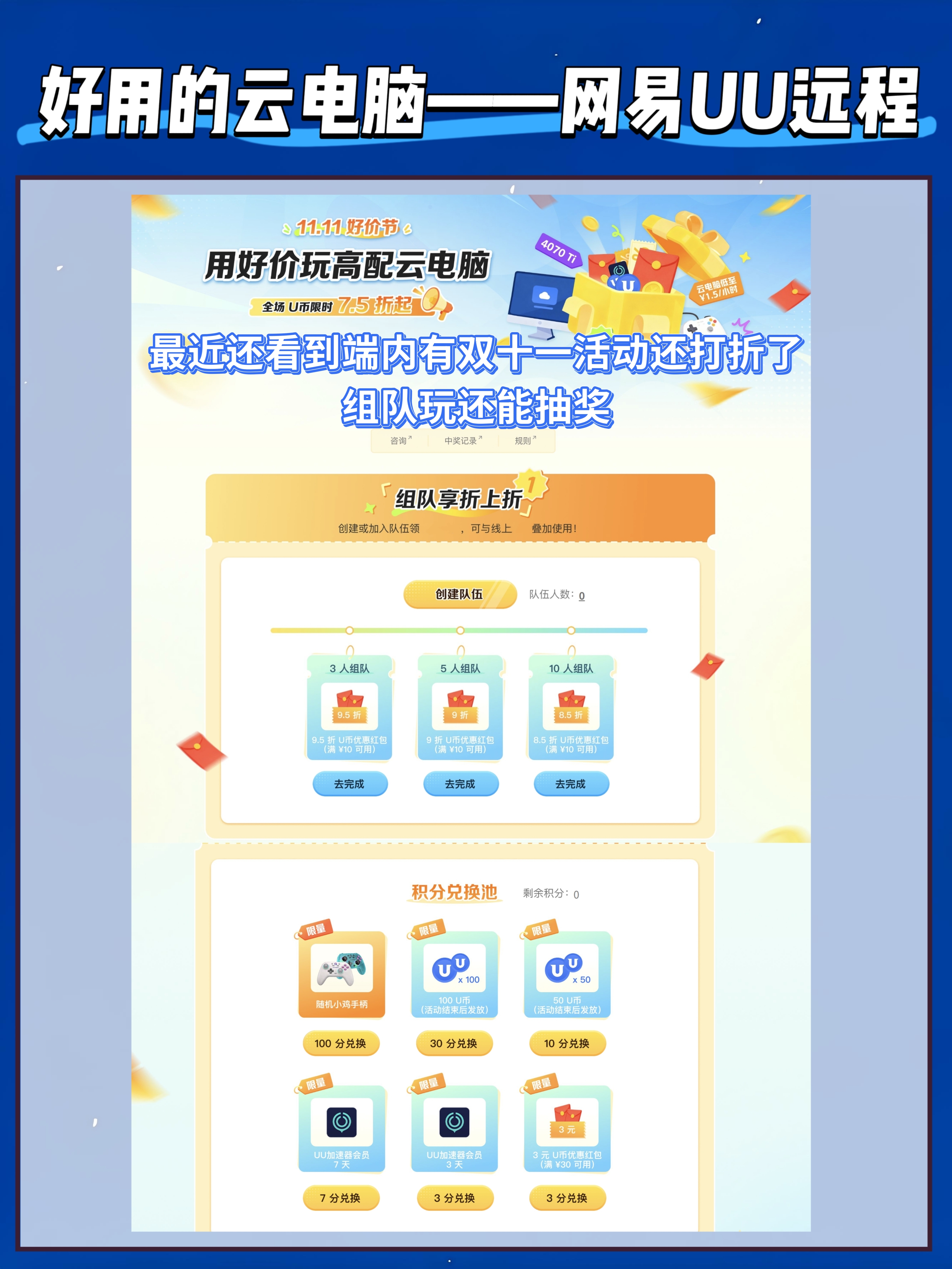 最近还看到端内有双十一活动还打折了,组队玩还能抽奖