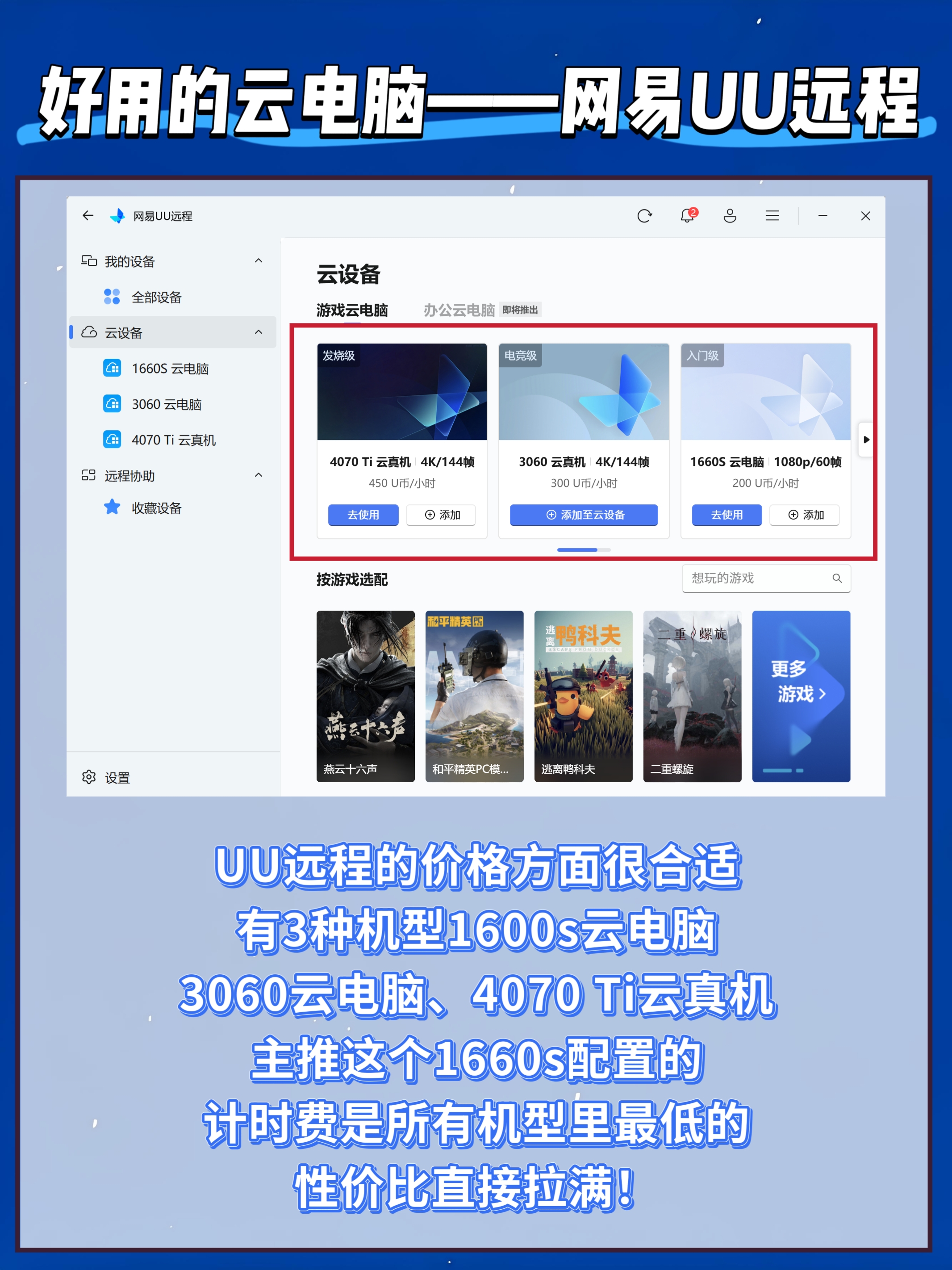 UU远程的价格方面很合适,有3种机型1600s云电脑、3060云电脑、4070 Ti云真机,主推这个1660s配置的,计时费是所有机型里最低的,性价比直接拉满!