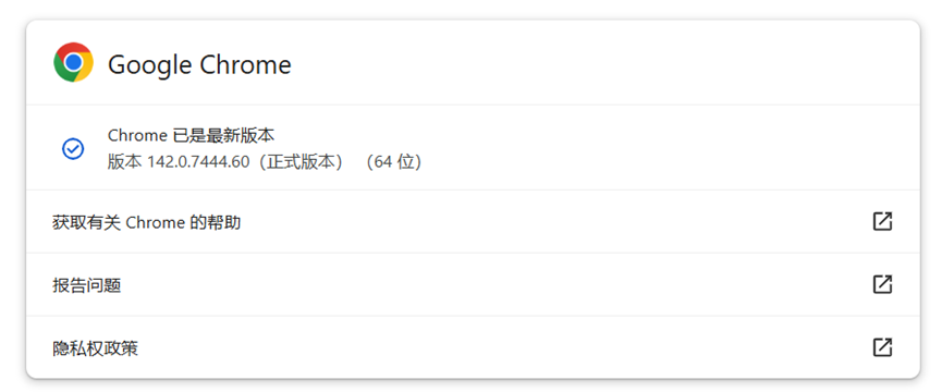 Chrome:设置→关于Chrome→版本号(如:版本 142.0.7444.60)。