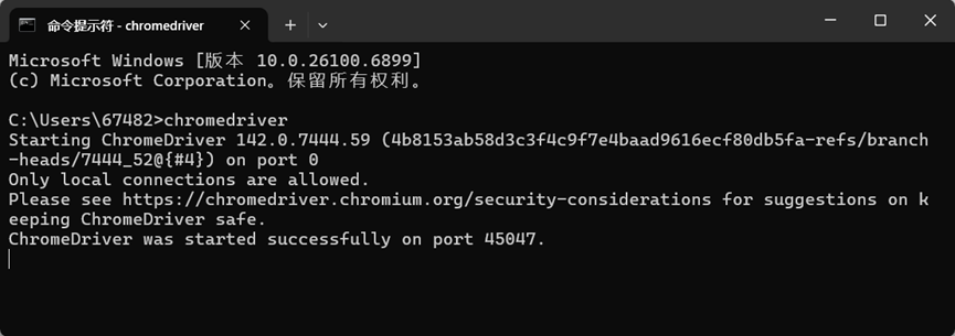 4.验证配置:终端输入Driver文件名chromedriver,输出版本信息则配置成功。