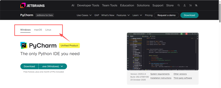 访问JetBrains官网下载PyCharm,根据操作系统选择合适的版本。(请自行解决激活码问题)