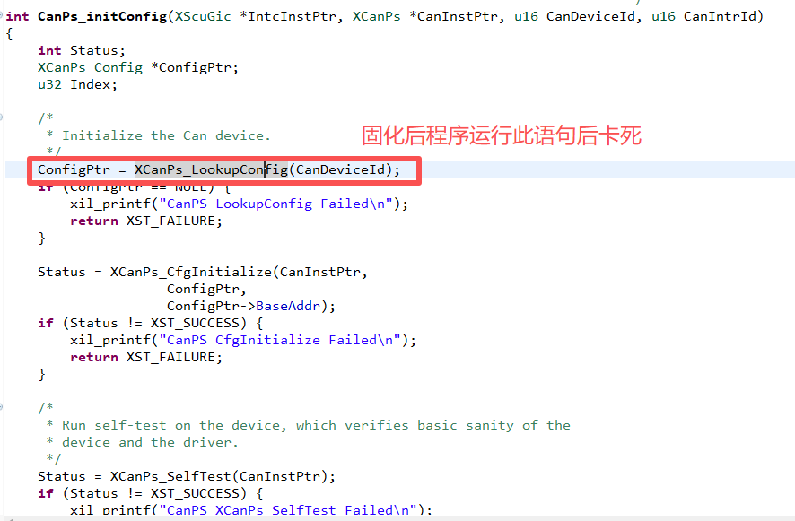 经过反复断点+插入串口标志调试,最终发现程序卡在了LookUpConfig处