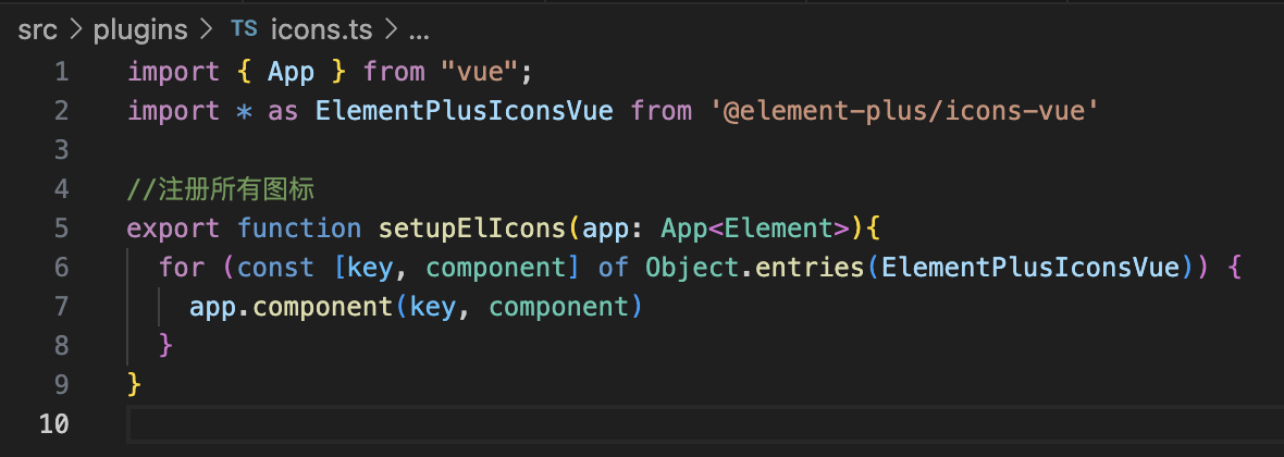 npm install @element-plus/icons-vue2、新建src/plugins/icons.ts文件,进行统一注册,内容如下: