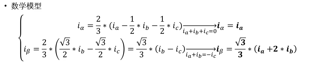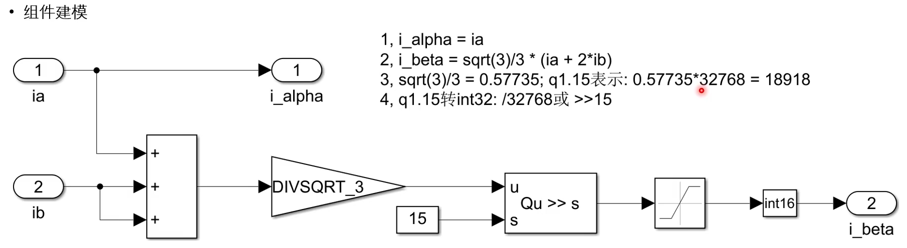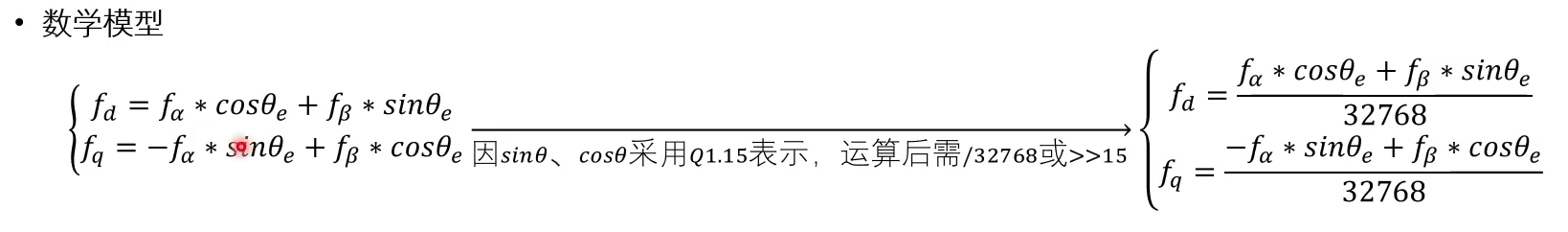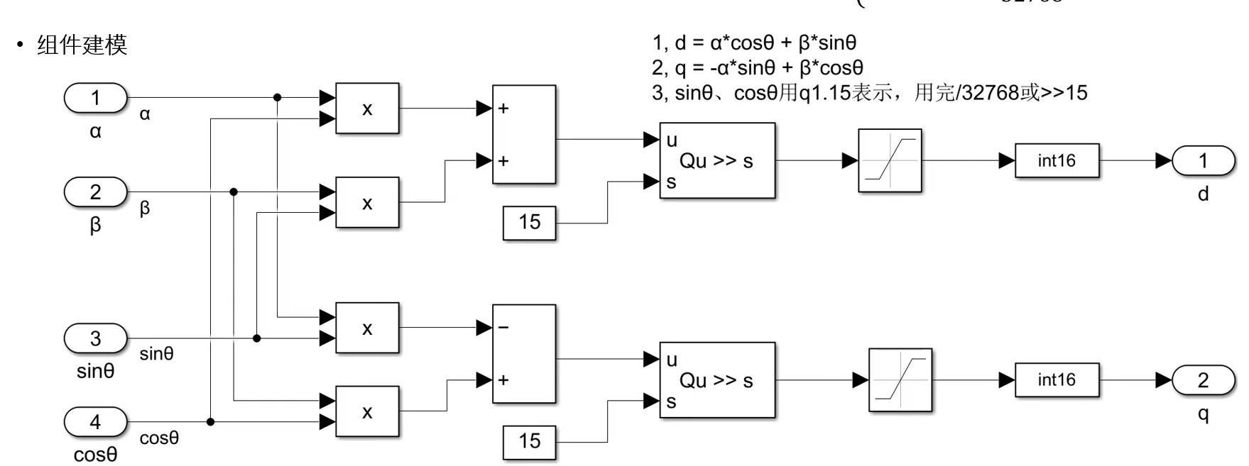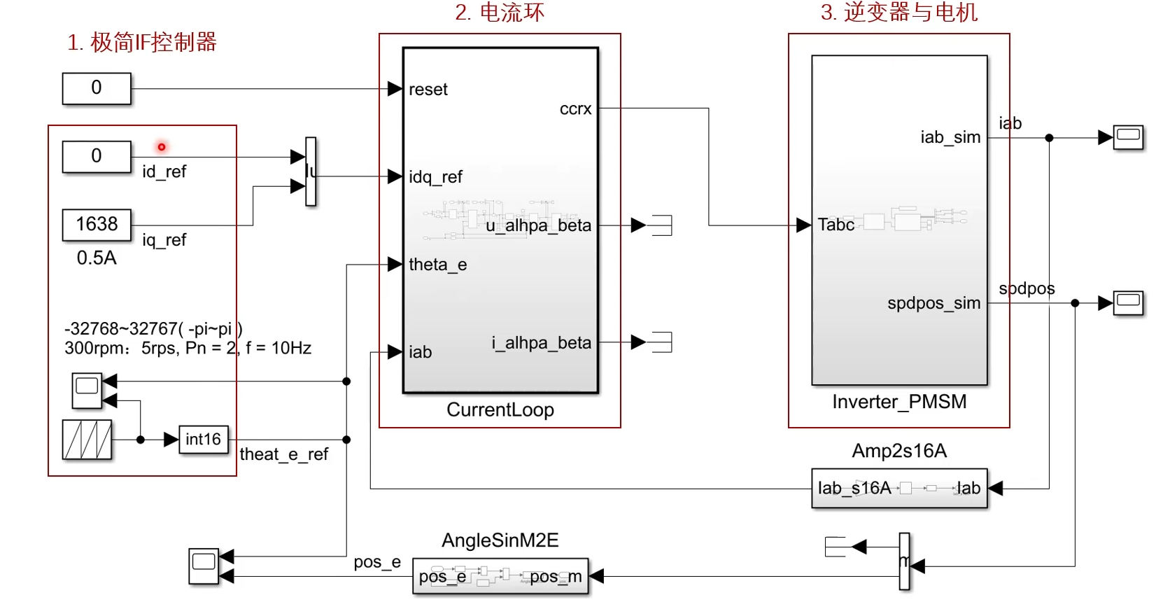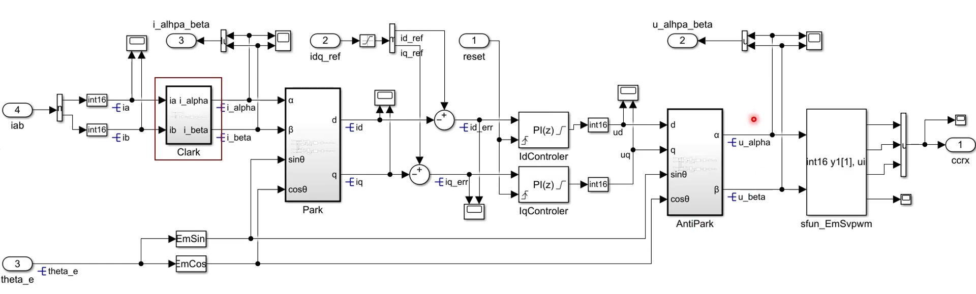 输入ABC坐标系下的反馈电流IA,IB,经过clark变换(三相变两相),输出αβ坐标系下的电流i_alpha,i_beta;经过park变换(交流变直流),得到dq坐标系下的反馈电流id,iq;它们和参考电流id_ref,iq_ref形成了电流误差,计算该电流误差作为PI控制器的输入;驱动PI控制器输出控制电压ud,uq,它们和电角度构成了旋转的电压矢量;通过antiPark变换(直流变交流),得到了αβ坐标系下的u_alpha,u_beta;通过SVPWM调制输出CCR(三相半周期作用时间)到逆变器及电机。
