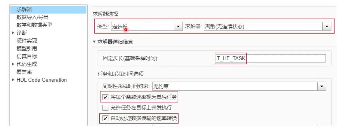 求解器:配置为定步长和离散型;固定步长与PWM频率保持一致,方便采样;