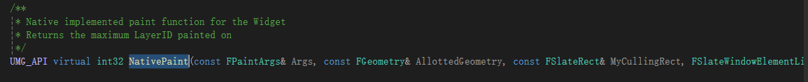 protected:virtual int32 NativePaint(const FPaintArgs& Args,const FGeometry& AllottedGeometry,const FSlateRect& MyCullingRect,FSlateWindowElementList& OutDrawElements,int32 LayerId,const FWidgetStyle& InWidgetStyle,bool bParentEnabled) const;void DrawSmoothedLine(FSlateWindowElementList& OutDrawElement,uint32 LayerId,const FGeometry& InAllottedGeometry,TArray<FVector2D> InPoints,float InThickness,FColor InColor)const;TArray<FVector2D> MultiplyPoint;