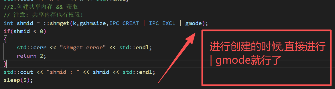 private:void CreateShmHelper(int shmflg){_key = ::ftok(gpath.c_str(),gprojId);if(_key < 0){std::cerr << "ftok error" << std::endl;return;}_shmid = ::shmget(_key,gshmsize,shmflg);if(_shmid < 0){std::cerr << "shmget error" << std::endl;return;}}