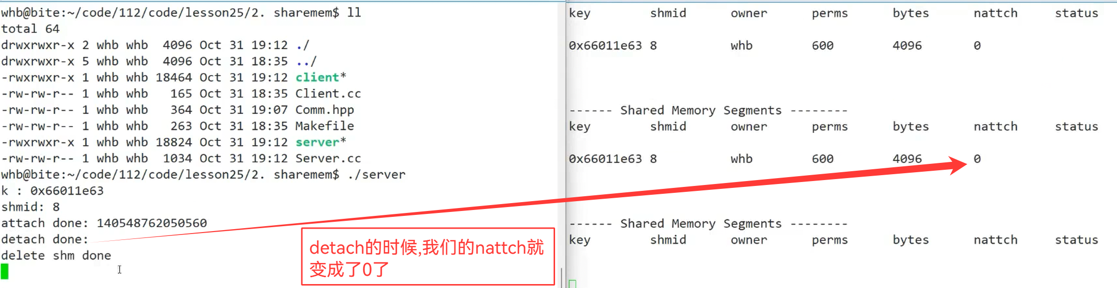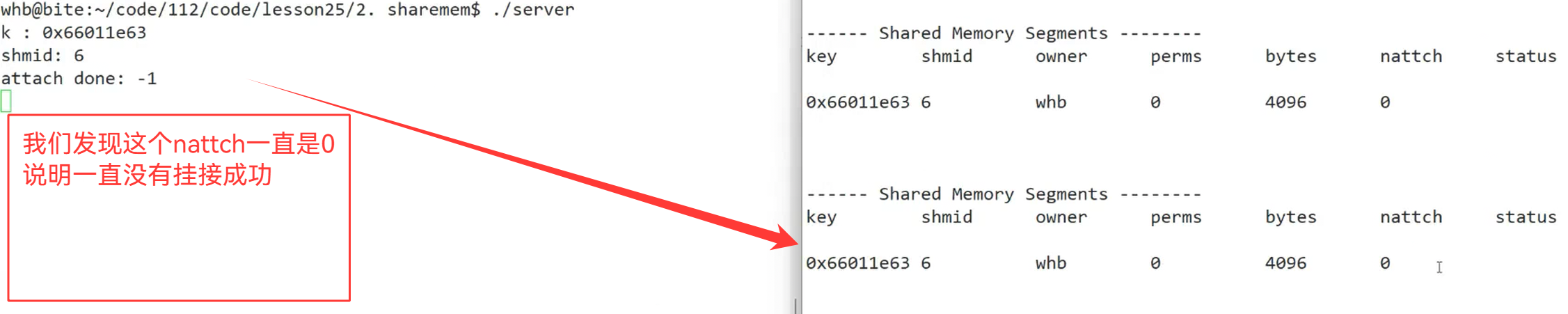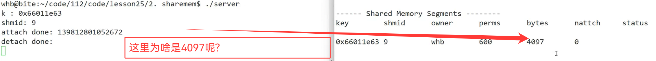 {//1.创建keykey_t k = ::ftok(gpath.c_str(),gprojId);if(k < 0){std::cerr << "ftok error" << std::endl;return 1;}std::cout << "k : " << k << std::endl;//2.创建共享内存 && 获取int shmid = ::shmget(k,gshmsize,IPC_CREAT | IPC_EXCL);if(shmid < 0){std::cerr << "shmget error" << std::endl;return 2;}std::cout << "shmid : " << shmid << std::endl;sleep(5);//3.共享内存挂接到自己的地址空间中void* ret = shmat(shmid,nullptr,0);std::cout << "attach done: " << (long long)ret << std::endl;sleep(5);//n.删除共享内存shmctl(shmid,IPC_RMID,nullptr);std::cout << "deete shm done" << std::endl;sleep(5);return 0;
