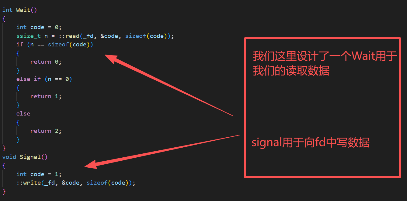 private:void OpenFifo(int flag){// 如果读端打开文件时,写端还没打开,读端对用的open就会阻塞_fd = ::open(gpipeFile.c_str(), flag);if (_fd < 0){std::cerr << "open error" << std::endl;}}public:Fifo() : _fd(-1){umask(0);int n = ::mkfifo(gpipeFile.c_str(), gfifomode);if (n < 0){// std::cerr << "mkfifo error" << std::endl;return;}std::cout << "mkfifo success" << std::endl;}bool OpenPipeForWrite(){OpenFifo(gForWrite);if (_fd < 0)return false;return true;}bool OpenPipeForRead(){OpenFifo(gForRead);if (_fd < 0)return false;return true;}int Wait(){int code = 0;ssize_t n = ::read(_fd, &code, sizeof(code));if (n == sizeof(code)){return 0;}else if (n == 0){return 1;}else{return 2;}}void Signal(){int code = 1;::write(_fd, &code, sizeof(code));}~Fifo(){if (_fd >= 0)::close(_fd);int n = ::unlink(gpipeFile.c_str());if (n < 0){std::cerr << "unlink error" << std::endl;return;}std::cout << "unlink success" << std::endl;}private:int _fd;