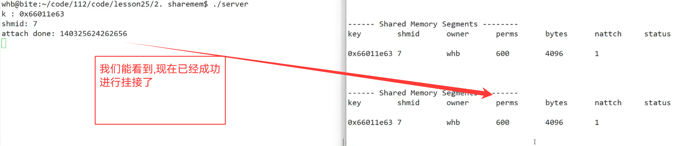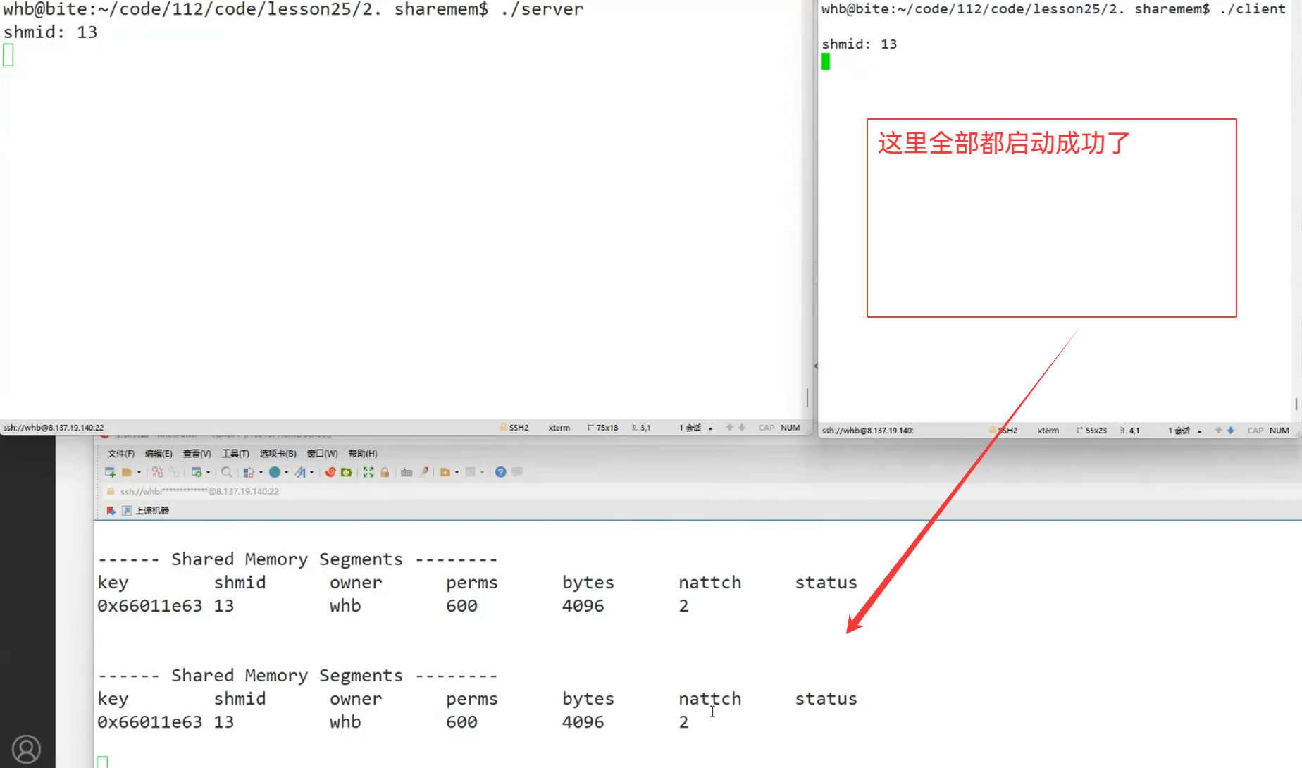 目前,我们还只是进行我们对应的创建共享内存,并进行挂接,还没有进行通信操作