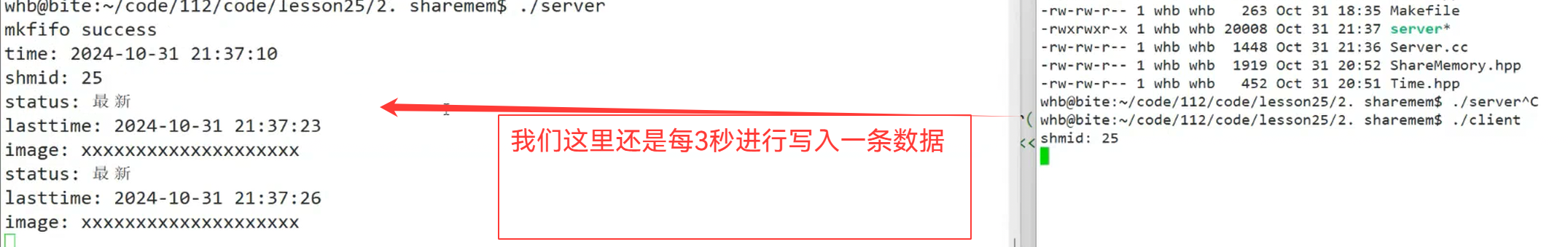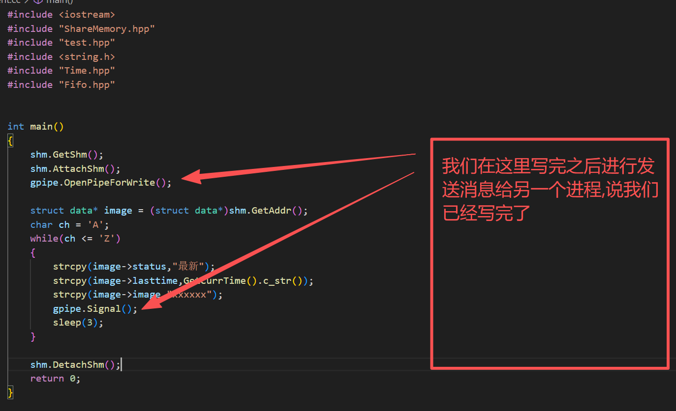{shm.GetShm();shm.AttachShm();gpipe.OpenPipeForWrite();struct data* image = (struct data*)shm.GetAddr();char ch = 'A';while(ch <= 'Z'){strcpy(image->status,"最新");strcpy(image->lasttime,GetCurrTime().c_str());strcpy(image->image,"xxxxxx");gpipe.Signal();sleep(3);}shm.DetachShm();return 0;