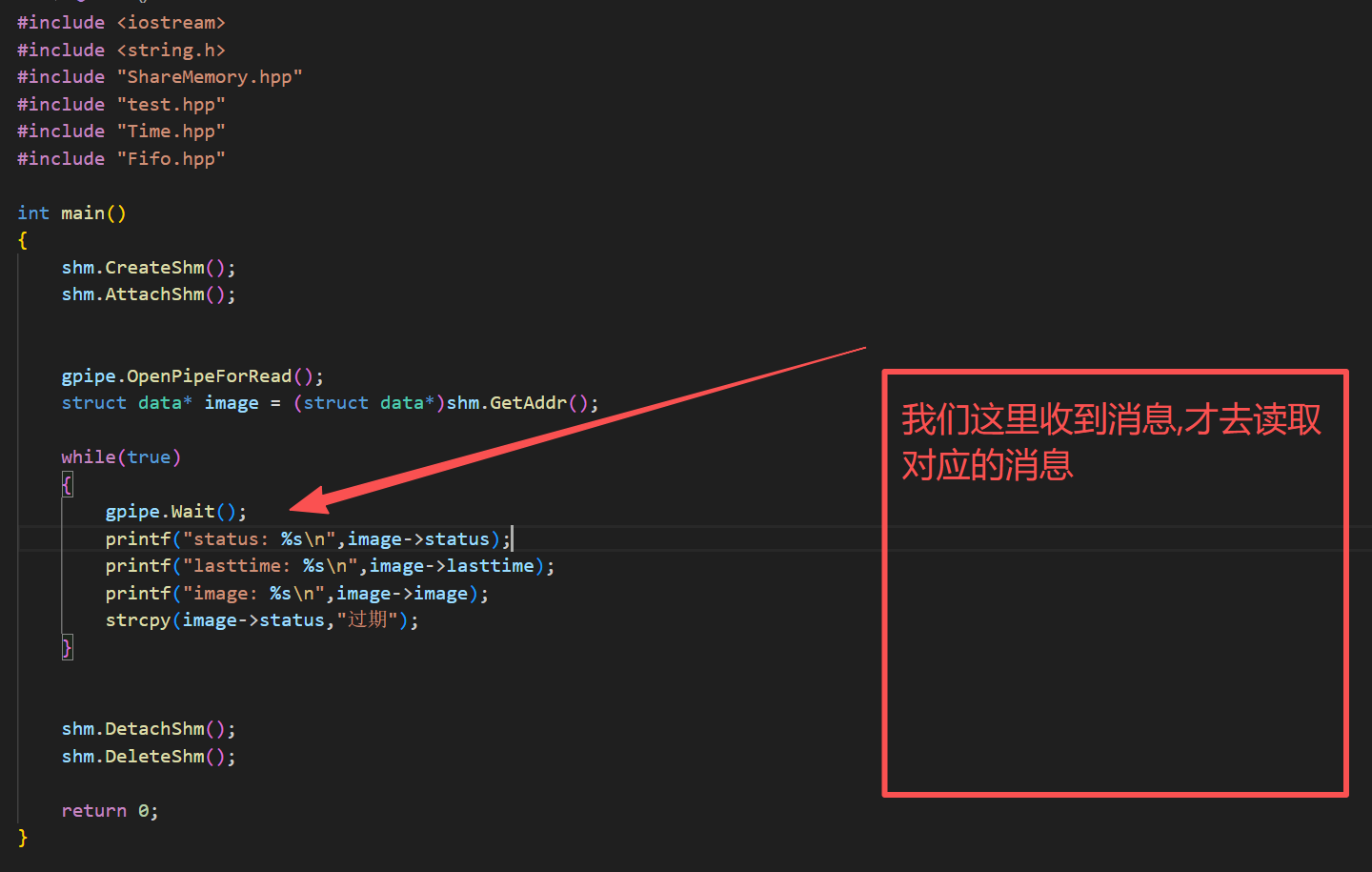 {shm.CreateShm();shm.AttachShm();gpipe.OpenPipeForRead();struct data* image = (struct data*)shm.GetAddr();while(true){gpipe.Wait();printf("status: %s\n",image->status);printf("lasttime: %s\n",image->lasttime);printf("image: %s\n",image->image);strcpy(image->status,"过期");}shm.DetachShm();shm.DeleteShm();return 0;