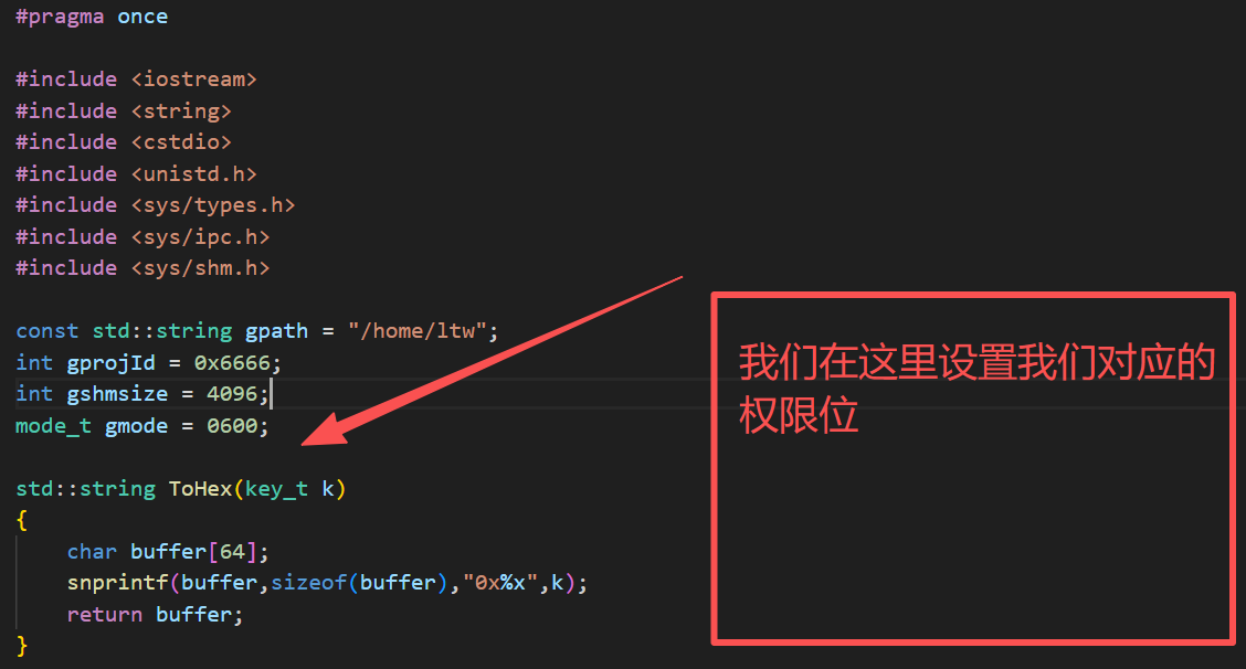 mode_t gmode = 0600;std::string ToHex(key_t k)