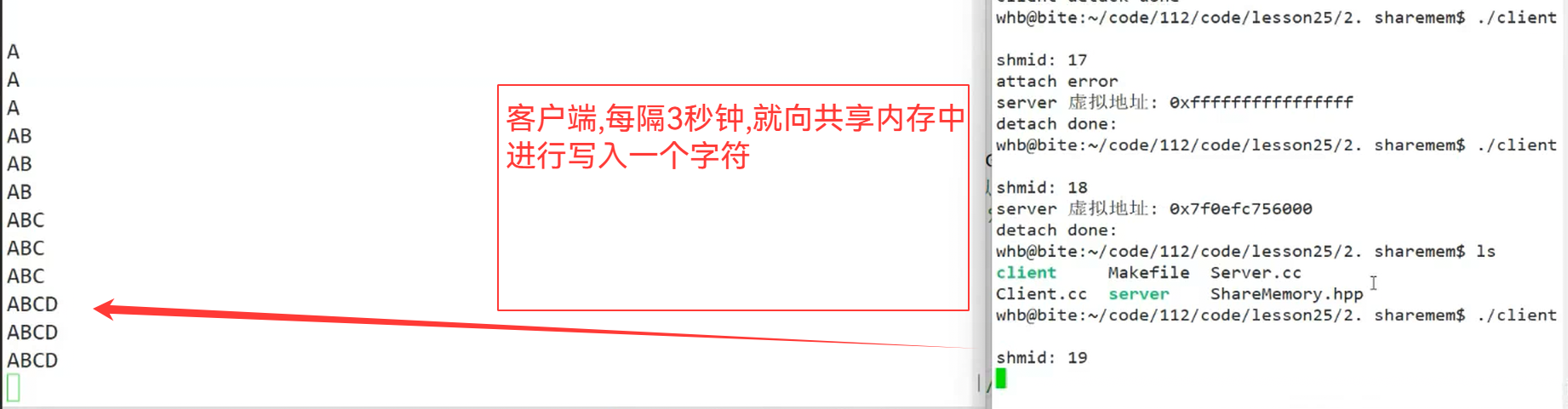 {shm.GetShm();shm.AttachShm();char* strinfo = (char*)shm.GetAddr();char ch = 'A';while(ch <= 'Z'){sleep(3);strinfo[ch - 'A'] = ch;ch++;}shm.DetachShm();return 0;