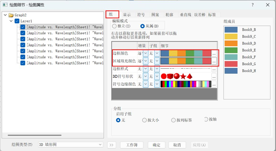 4.双击图形,在组对话框下,对边框颜色和区域填充颜色的增量选择“逐个”,颜色选择自己喜欢的颜色。