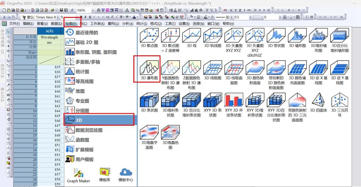 2.选中所有的数据,点击绘图—3D—3D瀑布图;