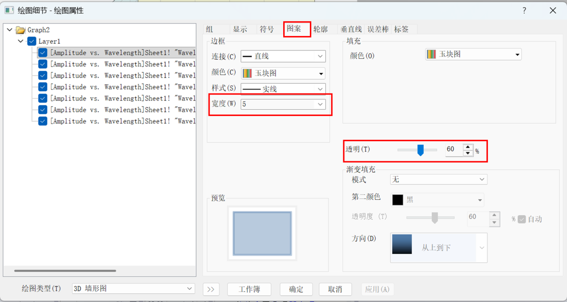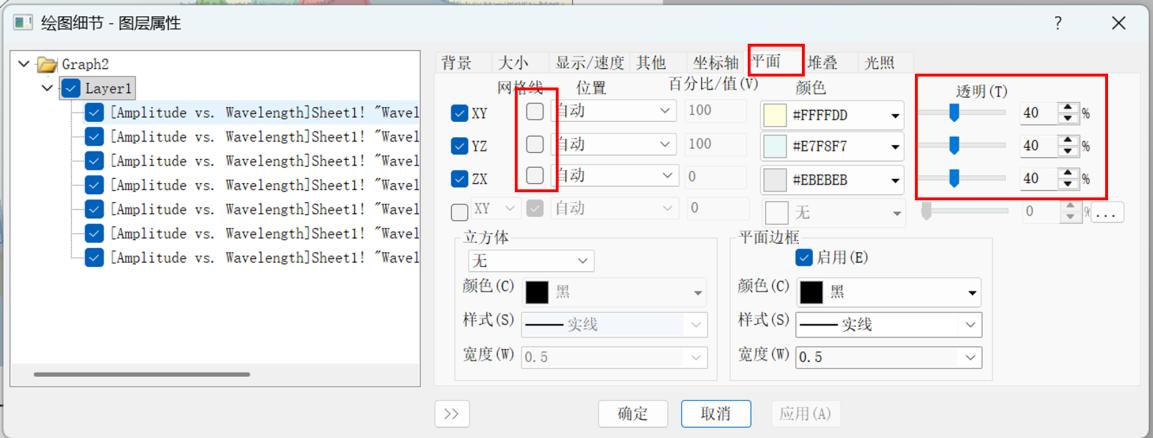 6.双击图形空白处,在跳出的对话框,点击平面,将网格线取消,透明度选择为40%。