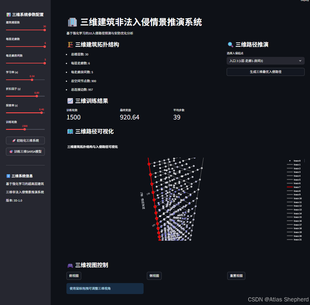 用Streamlit构建的交互式三维建筑非法入侵情景推演系统。系统使用SARSA强化学习算法来训练智能体在三维建筑拓扑中寻找最优入侵路径。以下是对代码的深度解读: