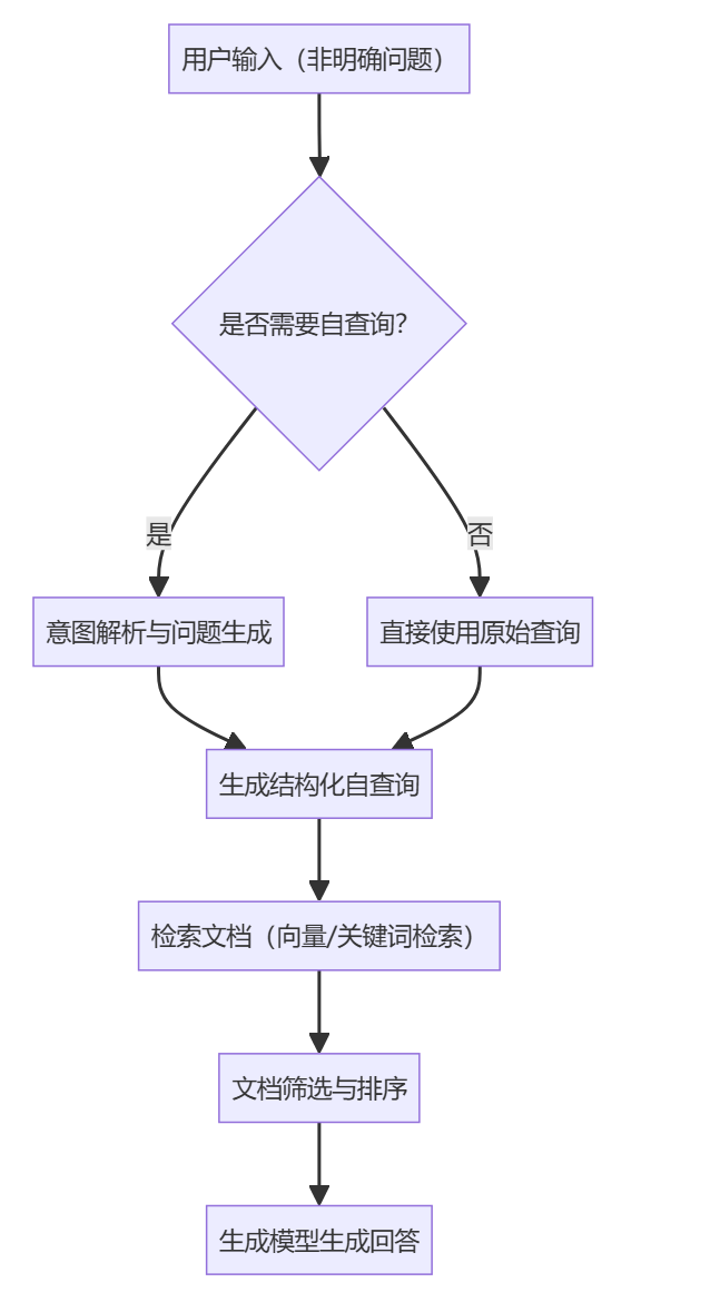 自查询(Self-Query)是指当用户输入 模糊表述或隐含需求时,RAG 系统通过内部处理让模型自动解析用户查询中的隐含条件(如时间、作者、标签等元数据),生成结构化查询语句的过程。