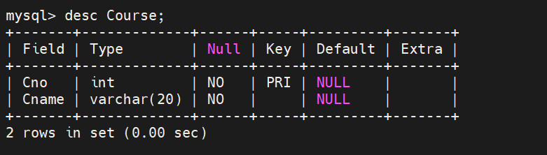 mysql> create table Course( Cno int primary key not null, Cname varchar(20) not null);结果: