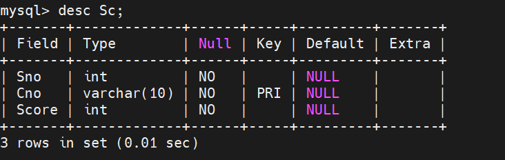 mysql> create table Sc(-> Sno int not null,-> Cno varchar(10) primary key not null,-> Score int not null);