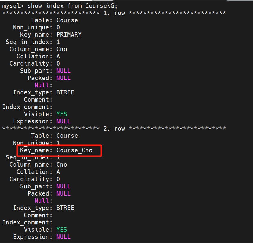 mysql> create index Course_Cno on Course(Cno);结果: