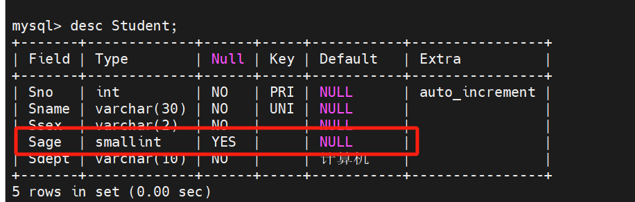 mysql> alter table Student modify Sage smallint;结果: