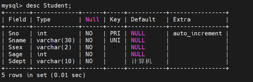 mysql> create table Student(-> Sno int primary key auto_increment,-> Sname varchar(30) not null unique ,-> Ssex varchar(2) check (Ssex='男' or Ssex='女') not null,-> Sage int not null,-> Sdept varchar(10) default '计算机' not null);