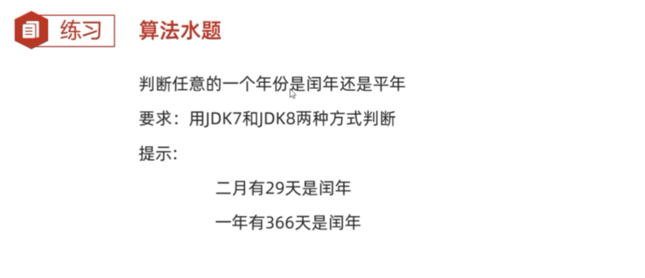 import java.util.Calendar;public class test7 {public static void main(String[] args) {/*判断任意一个年份是闰年还是平年要求:用JDK7和JDK8两种方式完成二月有29天是闰年一年有366天也是闰年*/// JDK7// 开始时间2000年1月1日 00:00:00// 结束时间2100年1月1日 23:59:59// 看看间隔是不是366天// 或者只看2月份// 开始时间:2000年2月1日 00:00:00// 结束时间:2000年3月1日 23:59:59// 看看间隔是不是29天// 但是很显然这俩中都比较麻烦// 介绍一个类:日历类// 简化1:我们可以把时间设置为2000年3月1日 00:00:00// 再把日历往前减去一天// 看看日历是28号还是29号?// 简化2:我们可以把时间设置为2000年1月1日 00:00:00// 再把日历往前减去一天// 统计是365天还是366天?// 默认是今天Calendar c = Calendar.getInstance();// 注意:月份的范围是0-11c.set(2000, 2, 1);// 减去一天c.add(Calendar.DAY_OF_MONTH, -1);// 获取结果int day = c.get(Calendar.DAY_OF_MONTH);System.out.println(day == 29 ? "闰年" : "平年");// JDK8:// 设定时间LocalDate ld = LocalDate.of(2000, 3, 1);// 减去一天ld = ld.minusDays(1);System.out.println(ld.getDayOfMonth() == 29 ? "闰年" : "平年");System.out.println("------------------------------------------------");System.out.println(ld.isLeapYear());}
