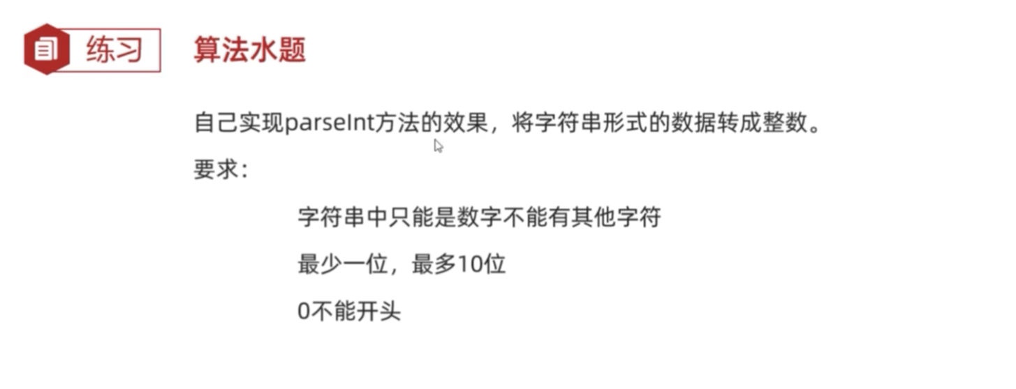 package com.lkbhua.MyApi.Test;public class test4 {public static void main(String[] args) {/*自己实现:parseInt方法的效果,将字符串转换为整数* 要求:字符串只能是数字不能有其他的字符最少一位,最多10位0不能开头*/// 1、定义一个字符串String str = "1";// 2、校验字符串// 习惯:先把异常数据进行过滤// 正则表达式是优解if(!(str.matches("[1-9]\\d{0,9}"))){// 错误数据System.out.println("错误数据");}else{// 正确数据System.out.println("正确数据");// 3、定义一个变量表示最终的结果int number = 0;// 4、遍历字符串得到其中的每一个字符for (int i = 0; i < str.length(); i++) {char c = str.charAt(i);// "1" - "0" --> 1int num = c - '0';// 每一位数字放到number当中number = number * 10 + num;}System.out.println(number);// 验证是否为整数System.out.println(number+1);}}