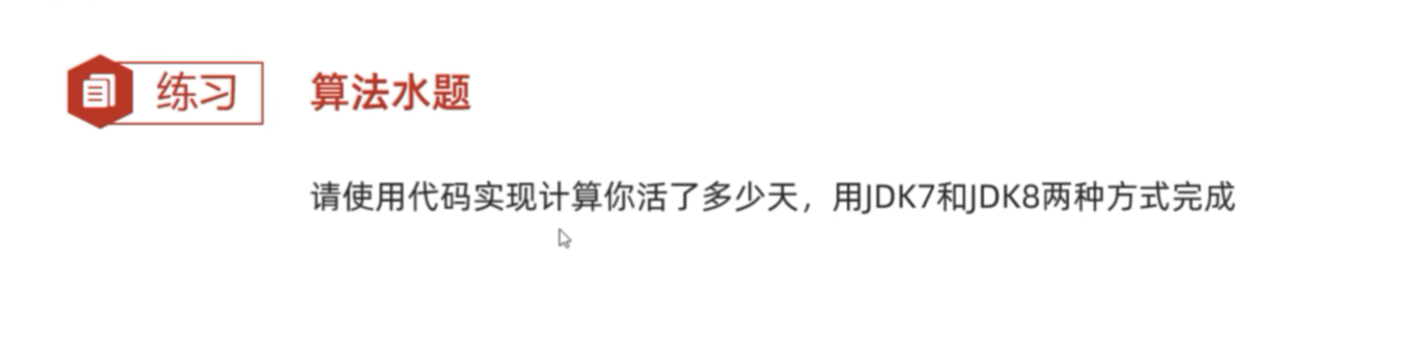 import java.time.temporal.ChronoUnit;public class test6 {public static void main(String[] args) throws ParseException {/*用代码的形式计算你到现在活了多少天*/// case1:JDK7之前的方式// 规则:只要对时间进行计算或者判断,都需要先获取当前时间的毫秒值// case2:JDK8的方法LocalDate birthTime = LocalDate.of(2000,1,1);LocalDate nowTime = LocalDate.now();long days = ChronoUnit.DAYS.between(birthTime,nowTime);System.out.println("活了"+days+"天");}private static void JDK7() throws ParseException {// 出生年月日// 1、计算出生年月日的毫秒值String birthday = "2005年1月1日";// 利用SimpleDateFormat进行解析SimpleDateFormat sdf = new SimpleDateFormat("yyyy年MM月dd日");// parse()方法会给我们返回一个Date对象Date date = sdf.parse(birthday);// 利用date.getTime()方法,获取出生时间的毫秒值long birthdaytime = date.getTime();// 2、获取当前时间的毫秒值long todayTime = System.currentTimeMillis();// 3、计算间隔多少天long time = todayTime - birthdaytime;long day = time / (1000 * 60 * 60 * 24);System.out.println("活了"+day+"天");}