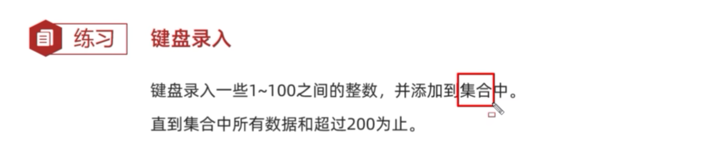 import java.util.Scanner;public class test3 {public static void main(String[] args) {/* 键盘录入一些1-100之间的整数,并添加到集合中* 直到集合中所有的数据和超过200为止*/// 1、创建一个集合ArrayList<Integer> list = new ArrayList<>();Scanner sc = new Scanner(System.in);// 2、键盘录入数据添加到集合中while(true) {System.out.println("请输入整数数字:");String numStr = sc.nextLine();// 3、把字符串转换成数字int num = Integer.parseInt(numStr);// 先把异常数据进行过滤if (num < 1 || num > 100) {System.out.println("输入的数字不符合要求,请重新输入");continue;}// num:基本数据类型// num——> Integer// 在添加数据的时候触发了自动装箱// 即 list.add(Integer.valueOf(num));list.add(num);int sum = getSum(list);if (sum > 200) {System.out.println("数据已经超过200,请勿继续输入");break;}}// 验证一下结论for (int i = 0; i < list.size(); i++) {System.out.print(list.get(i)+" ");}System.out.println();System.out.println("当前集合中的数据为:" + list);}// 定义集合中的求和方法private static int getSum(ArrayList<Integer> list) {int sum = 0;for(int i =0 ; i < list.size(); i++){// i: 索引// list.get(i): 集合中的元素sum += list.get(i);}return sum;}}