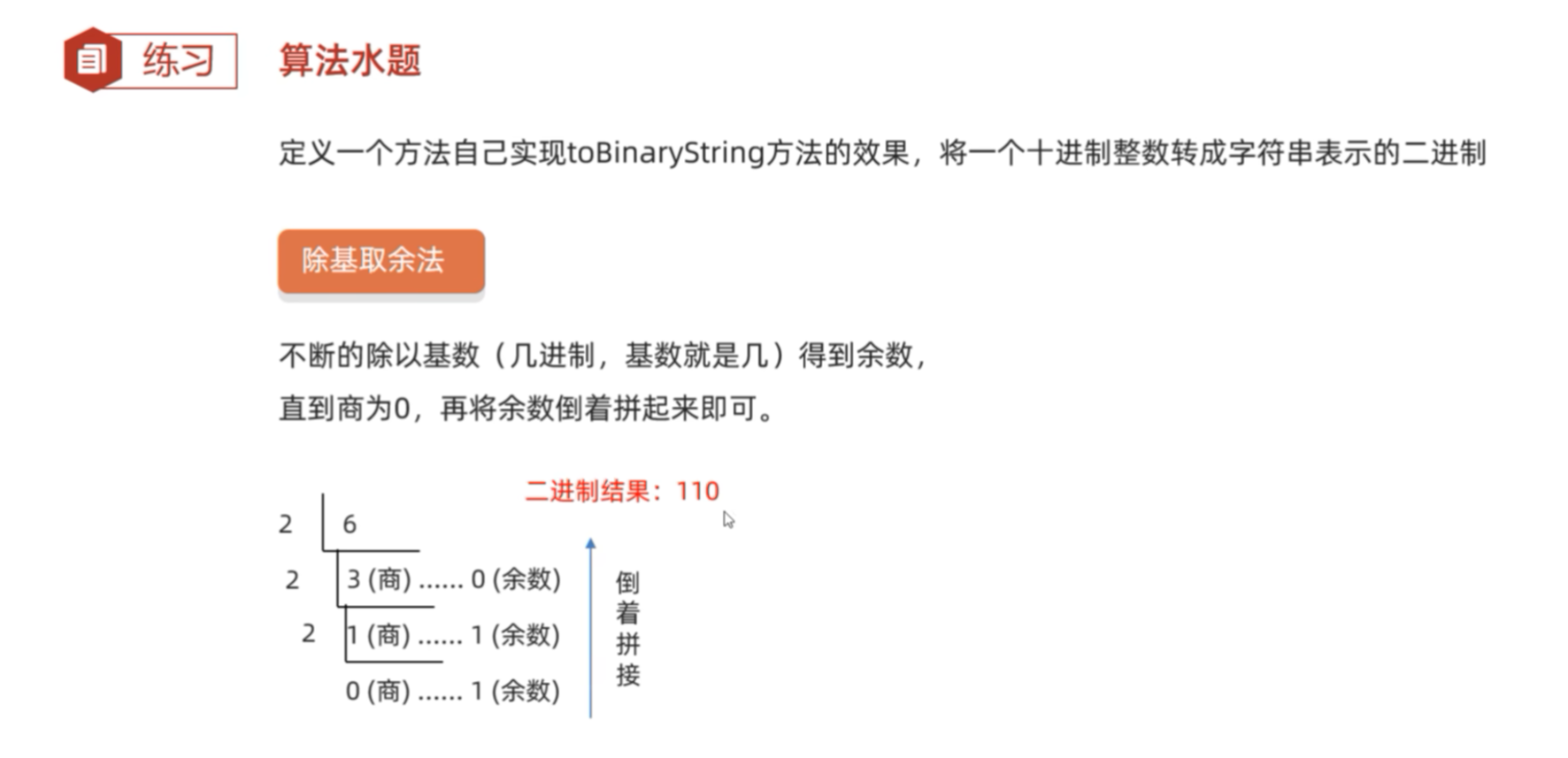 package com.lkbhua.MyApi.Test;public class test5 {public static void main(String[] args) {/*自己写一个方法实现toBinaryString的效果,将一个十进制转换成二进制*/System.out.println(toBinaryString(6));}public static String toBinaryString(int number){// 核心逻辑:// 不断的去除以2,得到余数,一直商到0为止// 还需要把余数倒着拼接起来// 定义一个StringBuilder的对象——用来拼接StringBuilder sb = new StringBuilder();// 利用循环while(true){if(number == 0){break;}// 切记:一定是先获取余数再除以2,很容易举个反例就知道原因了// 获取余数 %int remainder = number % 2;System.out.println(remainder);// 倒着拼接// insert(int index, String str) ;插入字符串// 每次都从头插入,插入的元素是这个余数——实现了倒着拼接sb.insert(0, remainder);// 除以2 /number /= 2;}// 返回拼接结果return sb.toString();}