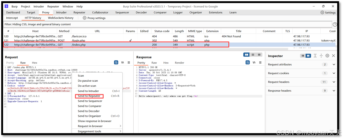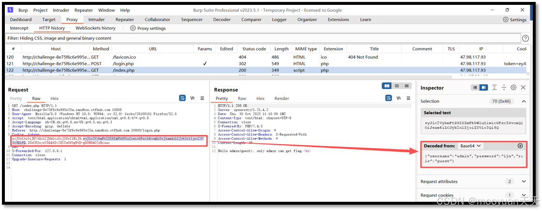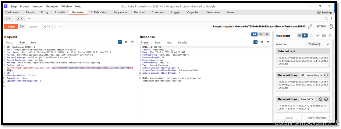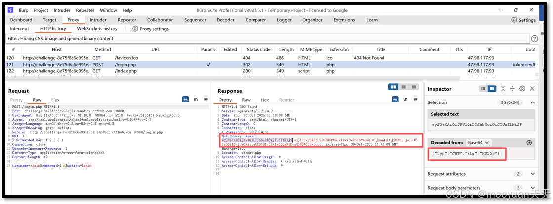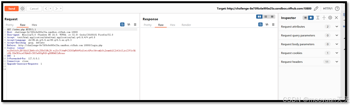 - 捕获 JWT 令牌:使用抓包工具,如 Burp Suite,拦截用户正常登录或访问页面时的请求,从中提取出 Cookie 或 Authorization 头中携带的 JWT 令牌。此时得到的 JWT 可能是默认使用了