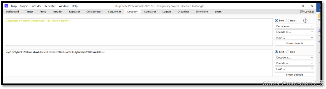 {"username":"admin","password":"ljn","role":"admin"},base64加密后结果如下所示。