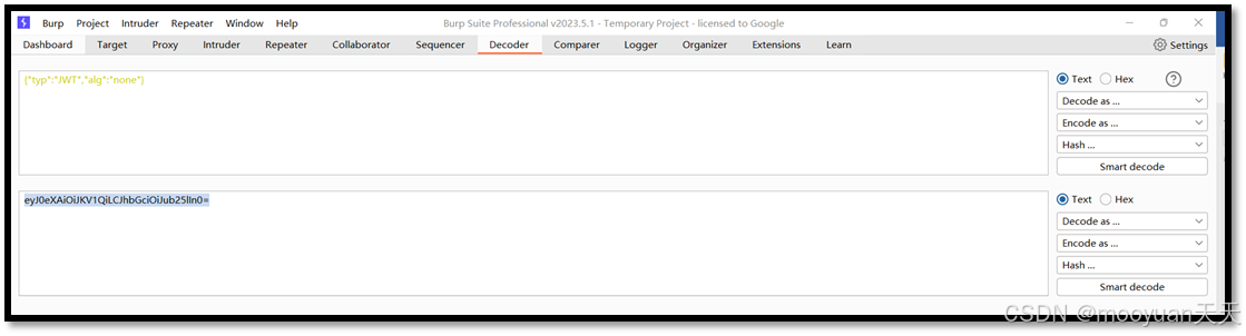 alg=None算法,或者服务器允许后续将其修改为该算法。 - 解码分析 JWT:通过 JWT 解码工具,如jwt.io或 Burp 插件等,对捕获的 JWT 进行解码。查看其 Header 部分,确认
