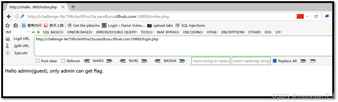 点击登录,页面提示如下所示“Hello admin(guest), only admin can get flag.”。