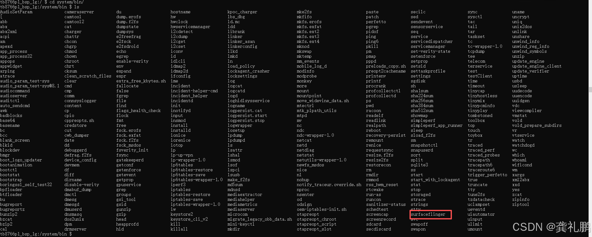 SurfaceFlinger是被编译成一个可执行的二进制档案:surfaceflinger,放在system/bin下面,可以在设备中查询到,如下: