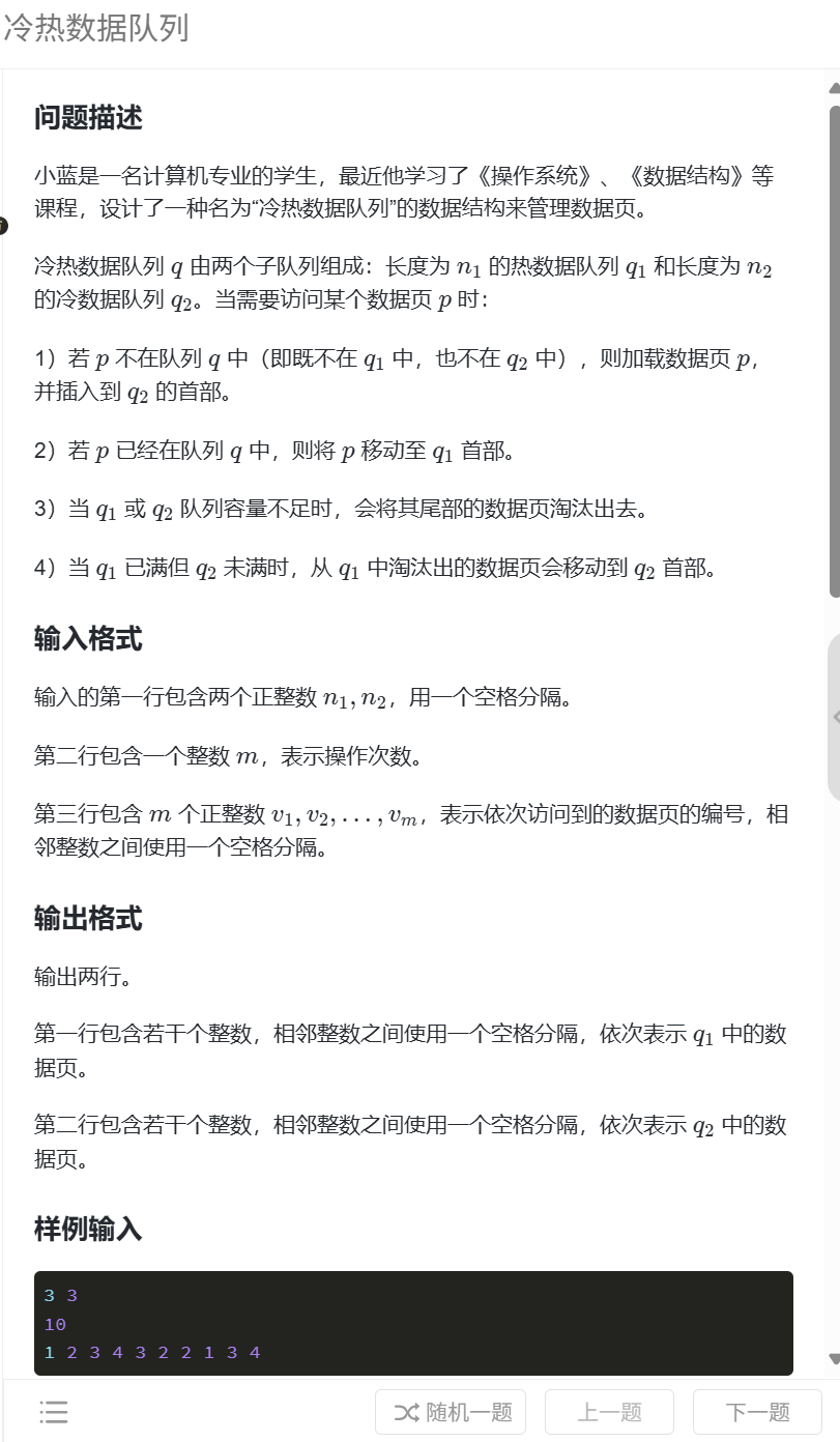 else if (q2.contains(v)) {q2.remove((Integer) v); // 从q₂中删除vq1.addFirst(v); // 移到q₁首部// 检查q₁是否溢出if (q1.size() > n1) {int removed = q1.removeLast();if (q2.size() < n2) {q2.addFirst(removed);}}