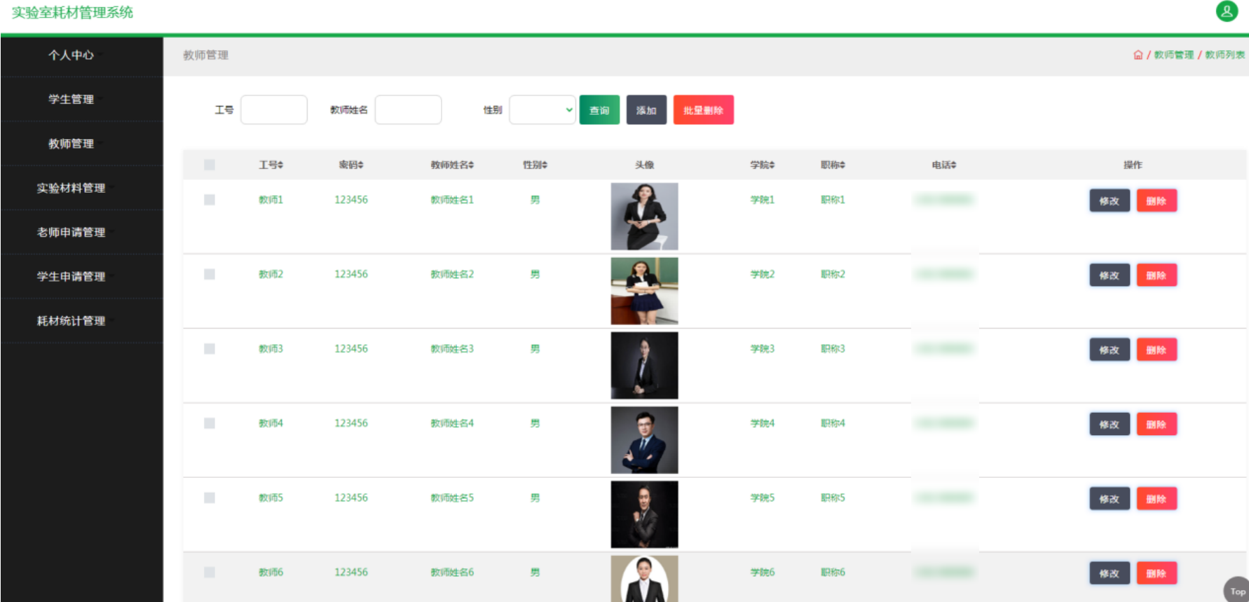 管理员进入指定功能操作区之后可以管理教师。其页面见下图。管理员可以增删改查教师资料。