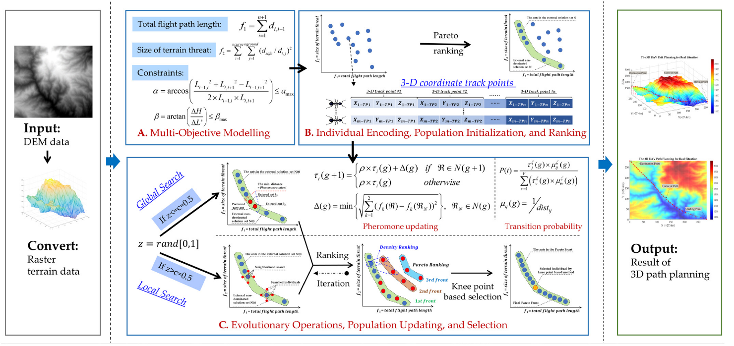 无人机三维飞行路径规划是灾难应急响应中的关键挑,。理想路径应平衡飞行路径长度与地形威胁,以缩短飞行时间并减少碰撞风险。传统方法难以平衡这些因素,且缺乏实际约束,导致优化效果不佳。本文提出了一种基于改进多目标群体智能算法(APPMS)的精确路径规划方法,通过将路径规划转化为多目标优化问题,同时优化飞行路径长度和地形威胁度。采用改进的蚁群优化算法提升了全局与局部搜索能力。通过模拟实验和实际应急数据验证了该方法的有效性。