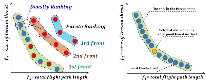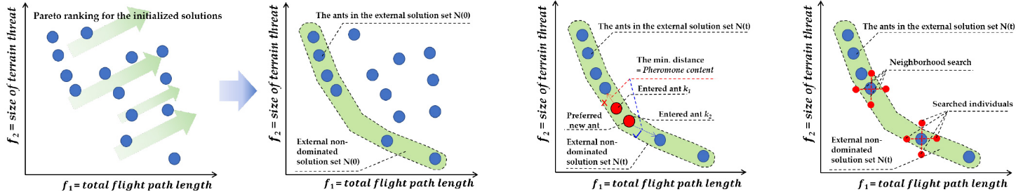 外部解集的排序:在搜索过程中,通过Pareto支配排序来区分优劣路径,并将当前的Pareto最优解存储在外部解集中。该解集引导蚂蚁在可行空间中搜索最优路径。