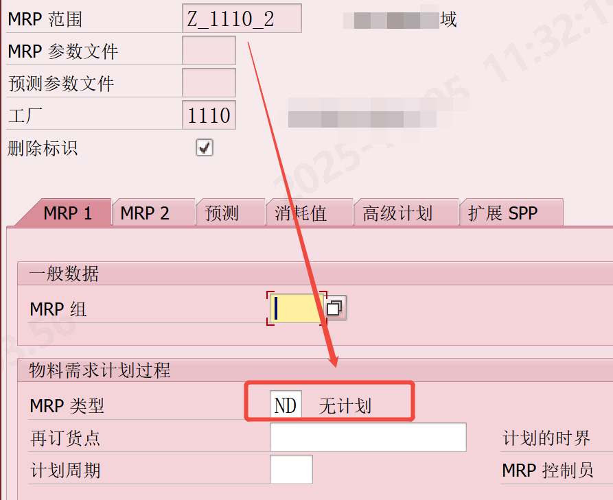 问题原因:该物料在同一个工厂下同时属于两个MRP区域,且一个区域的MRP类型为PD(需要MRP运行),另一个为ND(不运行MRP),这通常不会直接导致系统报错,但会影响MRP运行结果,甚至产生业务异常。在这次的错误中有个mrp区域是不使用的打上了删除标记,但是物料属性依旧是PD。