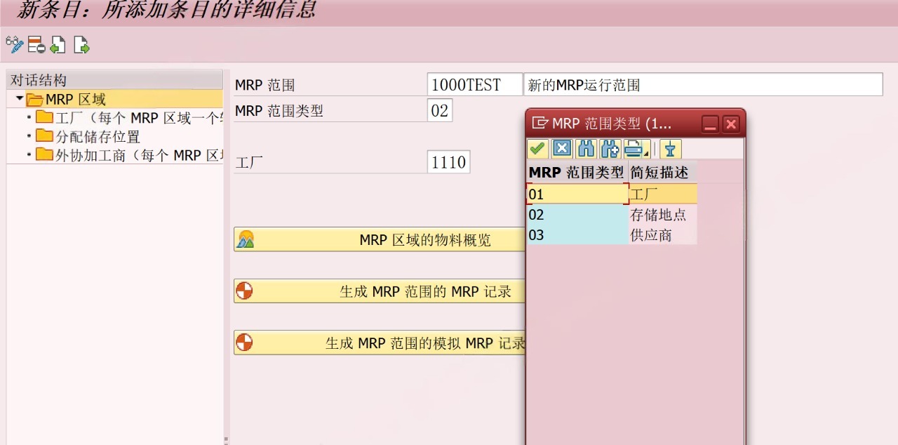 进入配置页面,点击“新条目”。输入MRP区域ID和描述,并选择MRP区域类型,填入工厂后保存会提示需要维护存储地点,填好分配到该区域的仓库维护保存。