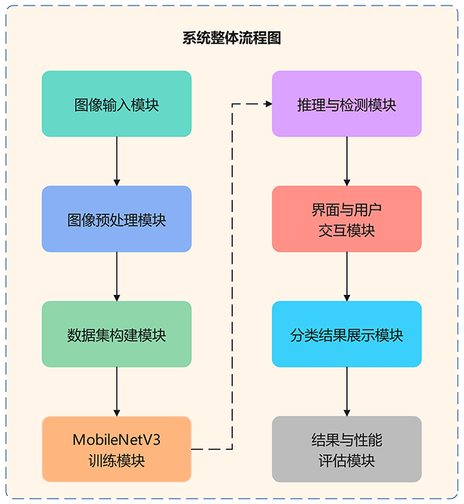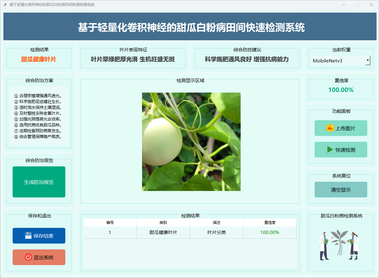 本系统为基于轻量化卷积神经网络的甜瓜白粉病田间快速检测系统,面向田间实拍叶片图像,采用 MobileNetV3 进行高效推理。通过“数据输入—模型推理—结果展示”流程,实现对白粉病与健康叶片的精准识别与置信度输出,显著提升病害现场诊断与农业生产管理效率。